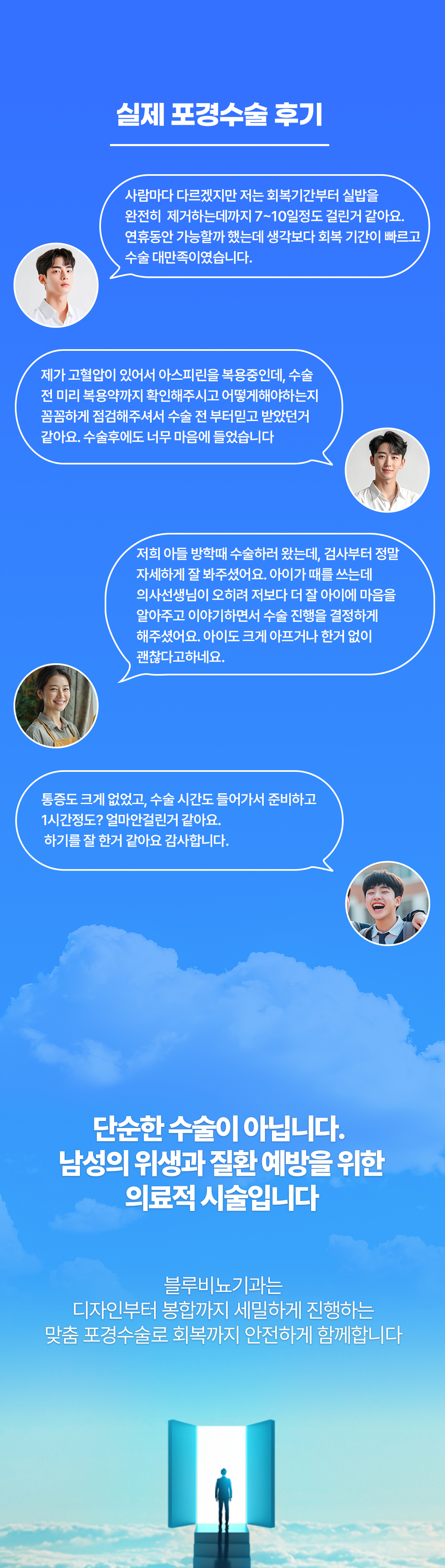 블루 더블업 포경수술은 슬리브 포경수술 방식을 이용하여 수술을 진행한 뒤 남은 속살을 제거하지 않고 귀두 뒤편으로 두툼하게 말아 음경의 볼륨감을 올려주어 확대 효과를 얻을 수 있는 방법입니다.